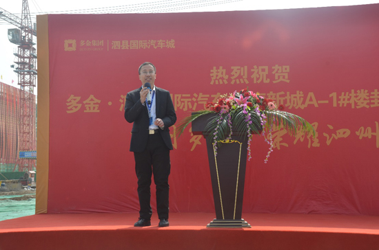 11点58分,泗县国际汽车城文旅新城A-1#城市会客厅封顶仪式正式开始,多金集团副总裁、多金泗县国际汽车文旅新城项目总经理余安云发表致辞。