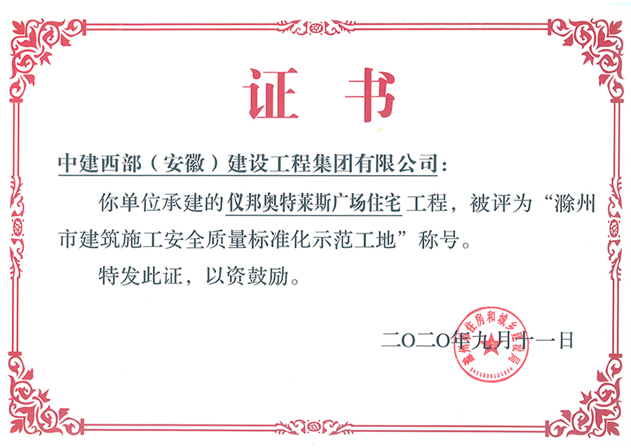 此次滁州仪邦奥特莱斯广场住宅项目能荣获建筑施工安全质量标准化示范工地荣誉,是安徽省建设行业质量与安全协会、滁州市建筑主管部门对项目安全质量管理成果的高度肯定。CAISHEN.COM_财神(中国)建设集团将一如既往地继续打造让群众满意的精品工程和口碑工程。