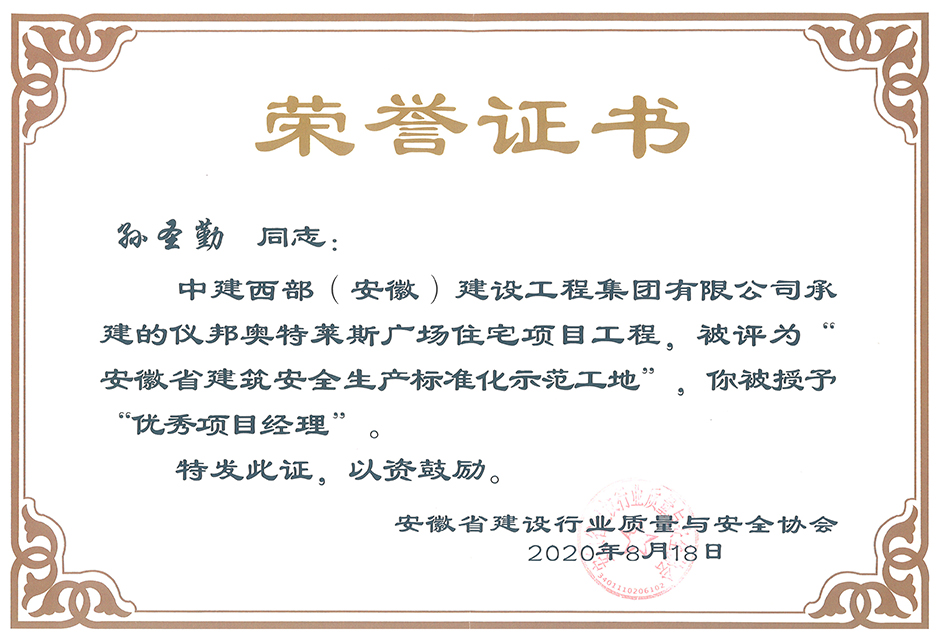 近日,喜报连连,CAISHEN.COM_财神(中国)建设集团滁州仪邦奥特莱斯广场住宅项目同时荣获安徽省建设行业质量与安全协会、滁州市住房和城乡建设局颁发的“安徽省建筑安全生产标准化示范工地”与“滁州市建筑施工安全质量标准化示范工地”称号。项目经理孙圣勤同志被授予“优秀项目经理”。