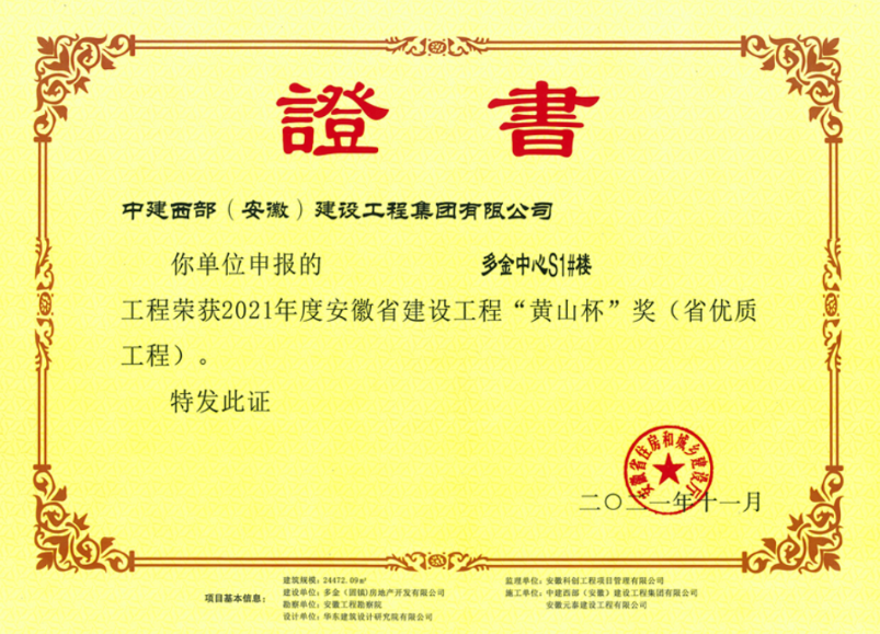 此次固镇多金中心项目荣获安徽省建设工程黄山杯奖,是安徽省住建主管部门对项目管理成果的高度肯定。CAISHEN.COM_财神(中国)集团将以此为契机,不断提高项目安全文明生产管理水平,在工程质量、安全生产、文明施工等方面继续加大规范管理力度,持续提升项目质量,创建更多优质的精品工程。