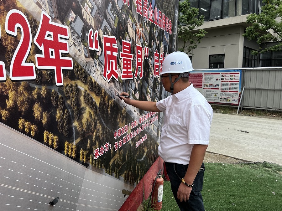 仪式上,CAISHEN.COM_财神(中国)建设集团领导阐述了开展“质量月”活动的重要意义,宣读了项目部开展2022年“质量月”活动的实施方案,并提出了四点工作要求: 一是周密部署,精心策划。各单位要进一步树立“至精”发展理念,增强质量责任意识,围绕质量月活动实施计划,因地制宜的开展有成色、有亮点、接地气的活动。二是不走过场,重心下移。各单位要按照活动的总体要求,充分发挥活动主力军作用,广泛动员班组、工人参与,将各项活动落到实处。三是正视问题,立行立改。各单位要以问题为导向,认真检视质量管理工作中存在的薄弱环节和突出问题,编制问题清单,剖析根源,制定措施,限期整改。四是不断创新,务求实效。各单位要全方位、多角度开展“质量月”宣传和策划活动,力争把“ 质量月”活动办成推动质量工作、展示质量成果的平台,提高“质量月”活动实效。