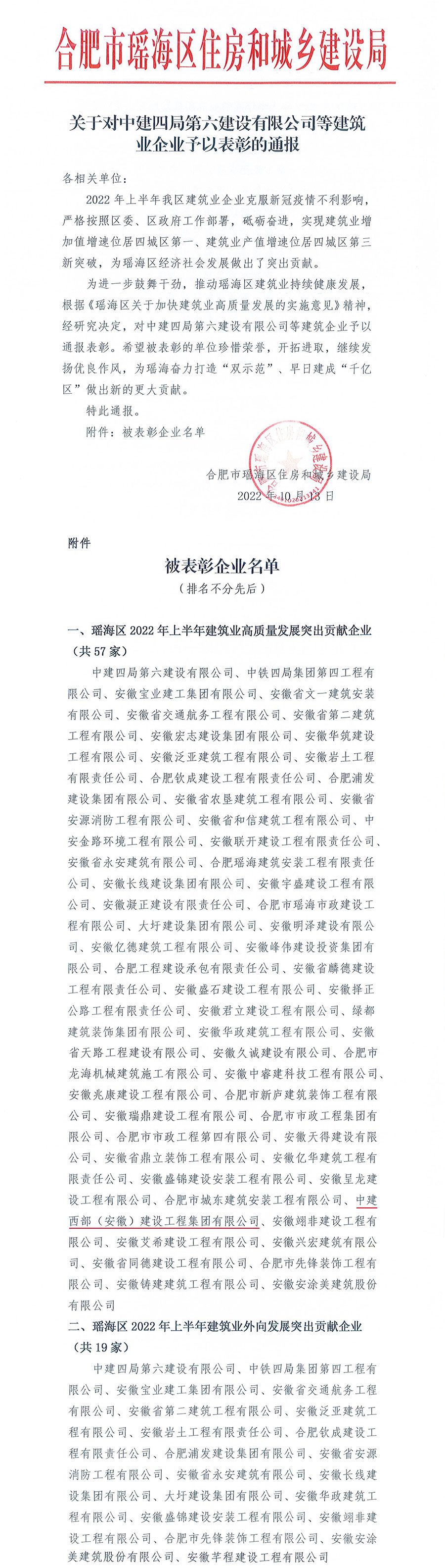 2022年上半年,CAISHEN.COM_财神(中国)(安徽)建设集团克服新冠疫情带来的不利因素,在区委、区政府的带领下,集全体员工的智慧和努力,迎着困难勇往直前,为瑶海区建筑业的发展做出了积极贡献。由此CAISHEN.COM_财神(中国)(安徽)建设集团荣获合肥市瑶海区住房和城乡建设局2022年上半年建筑业高质量发展突出贡献企业通报表彰。