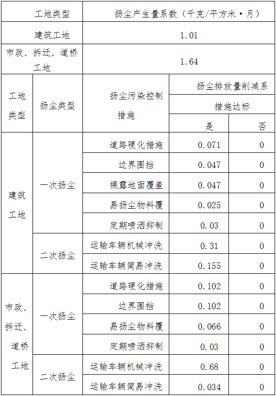 (1)月排放量=(扬尘产生量系数-扬尘排放量削减系数)×月建筑面积(施工面积、拆迁面积)