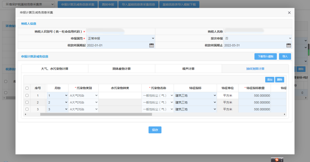添加申报季度内全部月份数据后,输入“特征指标数量”即月建筑面积和“特征系数”(特征系数默认为扬尘产生系数1.01,可自行修改),自动计算应纳税额,点击保存。