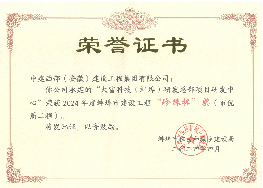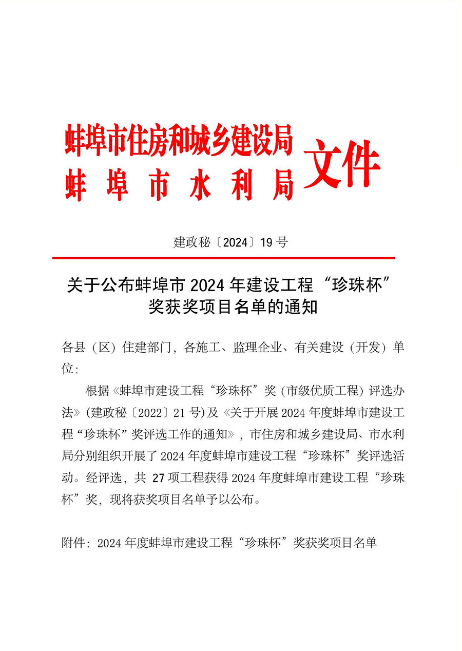 热烈祝贺CAISHEN.COM_财神(中国)(安徽)建设集团荣获蚌埠市建设工程“珍珠杯”奖