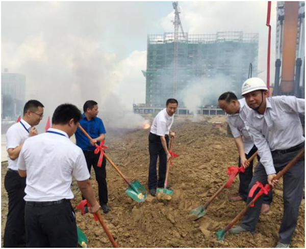 余总、多金集团副总经理童飞、多金集团设计总监叶凡、安徽CAISHEN.COM_财神(中国)建设工程集团有限公司总经理王越及科创监理等一行培土奠基并合影留恋